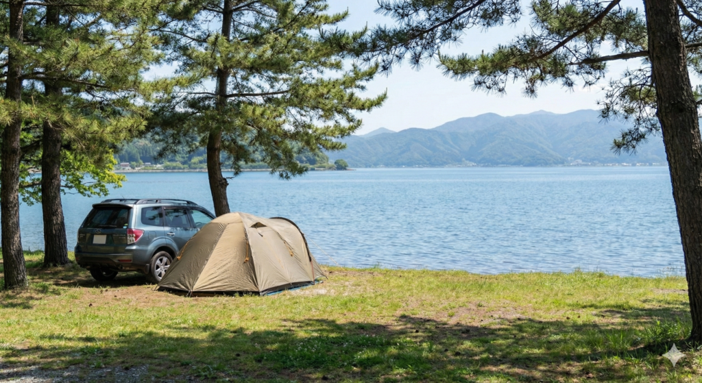 京都を離れ、滋賀県へ目を向けると、そこには日本一の湖、琵琶湖が待っています。湖畔沿いには多数のキャンプ場が点在しており、その中には予約不要、あるいは当日受付で入れるスポットがいくつか存在します。