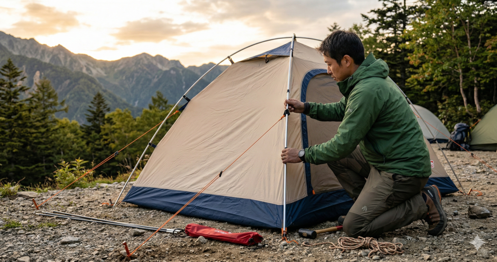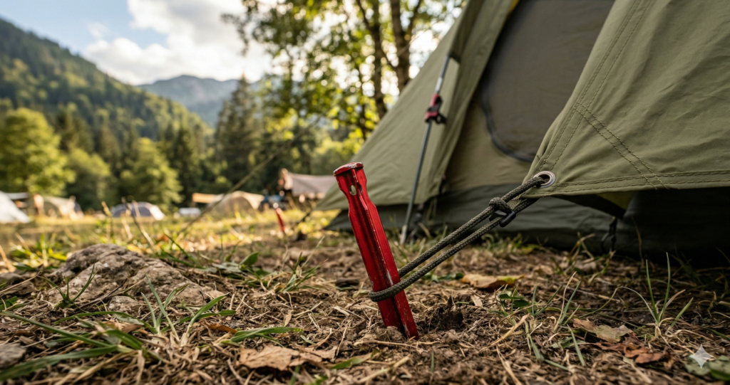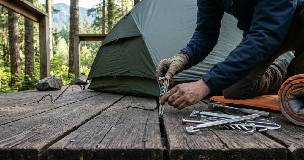 ウッドデッキに到着して最初にキャンパーを絶望させるのが、「いつものソリッドステーク(鍛造ペグ)が使えない!」という事実です。デッキの板に直接ペグを打ち込むのは当然ながら器物損壊なので絶対NG。では、どうやってテントを固定するのでしょうか?