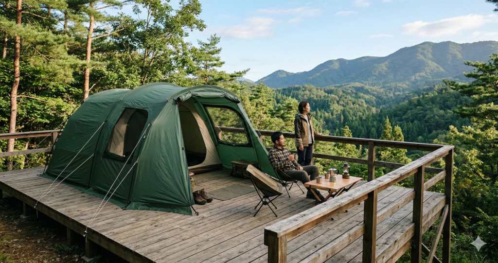 標高1,200mにある長野県の雨飾高原キャンプ場などでもウッドデッキが採用されていますが、その最大の恩恵は「雨の日でも地面がぬかるまない」ことです 。木材の隙間から雨水がスッと下に抜けていくので、テントの底(ボトム)がドロドロになる悲劇とは無縁になります。撤収のとき、グラウンドシートを拭く手間が省けるだけで、キャンプの疲労度は半分以下になりますよ!